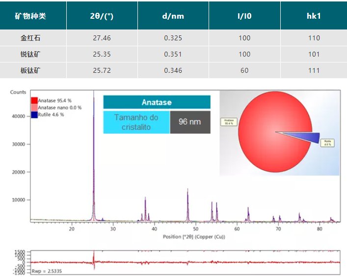 下表為金紅石、銳鈦礦和板鈦礦的XRD主衍射峰數(shù)據(jù),可以看到雖然金紅石和銳鈦礦在結構上有共同相似的特點,但由于金紅石與銳鈦礦的最強衍射峰一個在27.46°(/2?)左右,一個在25.35°(/2?)左右,因此將兩者可較輕易區(qū)分開來。部分板鈦礦的最強峰與銳鈦礦的最強峰接近,但根據(jù)傳統(tǒng)的三強法仍能將兩者區(qū)分開來[3]。
