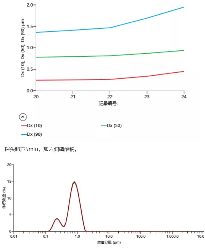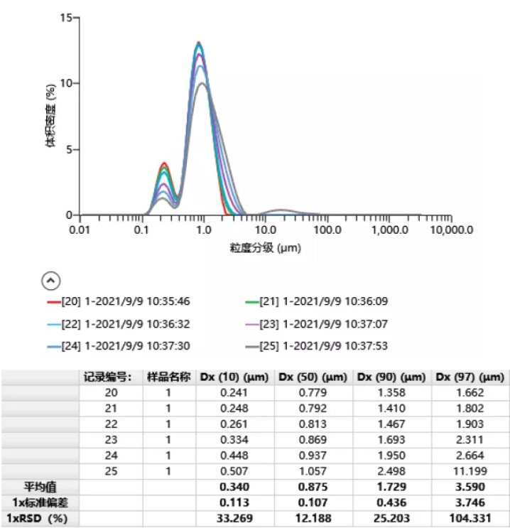 馬爾文帕納科Mastersizer 3000激光粒度儀,探頭超聲5min,連續(xù)測試樣品粒徑逐漸增加,粒度分布圖如下。