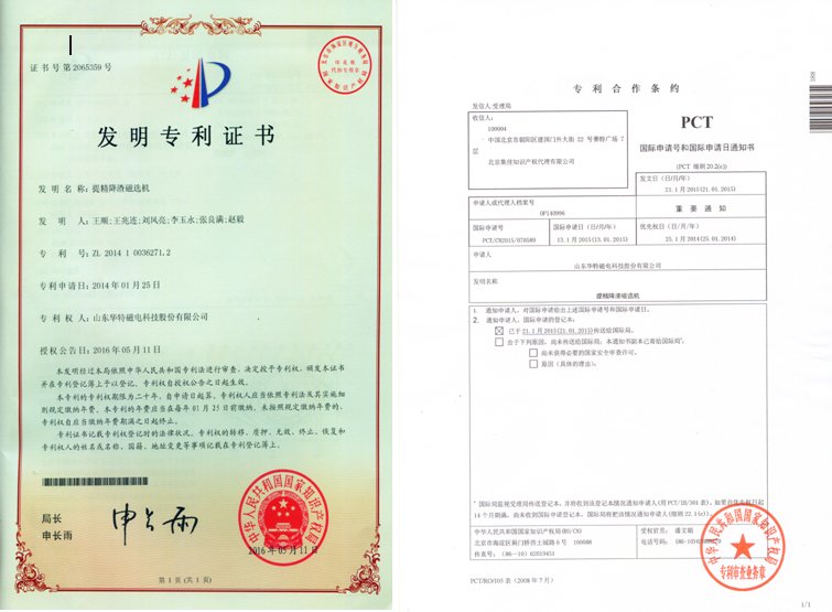 “提精降渣磁選機”是華特公司自主研發(fā)的專利產(chǎn)品,擁有國內(nèi)發(fā)明專利授權(quán)1件、PCT專利授權(quán)1件, 2014年列入山東省科技發(fā)展計劃,2015年通過新產(chǎn)品鑒定。