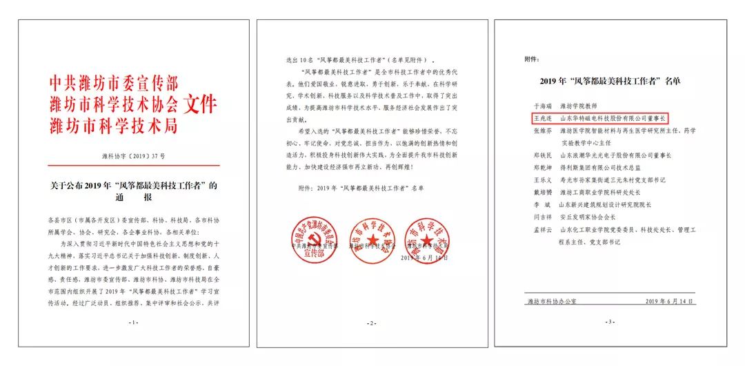 經過廣泛動員、組織推薦、集中評審和社會公示,共評選出10位“風箏都最美科技工作者”,山東華特磁電公司董事長兼總裁王兆連同志榮耀登榜。