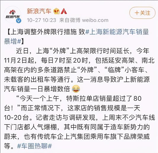 今年 11 月 2 日起,每日早七點至晚八點,包括延安高架、南北高架在內的多條道路禁止“外牌”、“臨牌”小客車、未載客的出租車等通行。因為新能源汽車車牌較容易獲得,不少人轉投新能源汽車,因此帶動了新能源汽車的銷量,讓新能源又小火了一把。