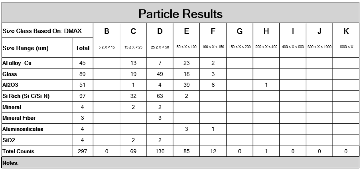 所有單顆粒的信息均可調用查看 此外,還可將不同的顆粒按成分及數量進行分級,對應 Class B-K 等級,幫助工程師更好的判斷產品的清潔程度。如電池中 Cu,Fe 等金屬及其氧化物等硬質雜質,若數量過多或尺寸過大,對材料的壽命會有較大影響。通過分級歸類,各級供應商可判斷材料是否符合要求。