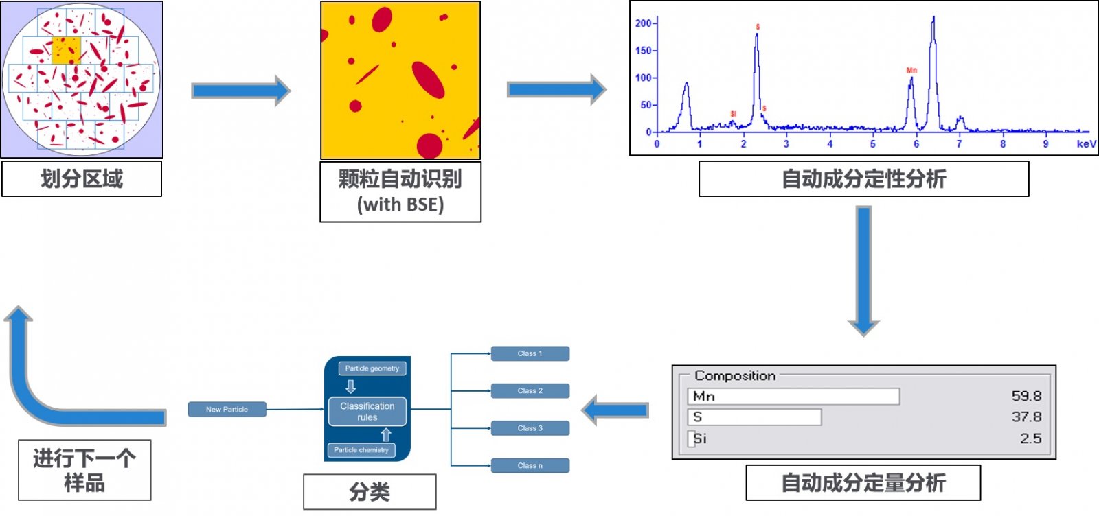 不同化學成分顆粒的分級 以正極材料為例,一般正極材料的關鍵性能指標有:化學成分、晶體結構、粒度分布、振實密度、比表面積、PH 值、首次放電比容量、首次充放電效率、循環壽命等。通過 Particle X 系統,不僅可以獲得雜質信息,對于正極材料本身也可以做出全面的掃描監測。