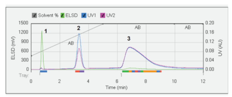 實驗結果表明,傳統快速色譜系統對非發色團化合物的分離和檢測效果不佳,而 Pure C-815 系統憑借其先進的 ELSD 檢測技術,能夠在純化過程中精準識別并分離反應混合物中的非發色團化合物(1)。這一技術突破顯著提升了樣品的回收率,為后續的藥物分析和研發提供了更純凈、更可靠的樣品。